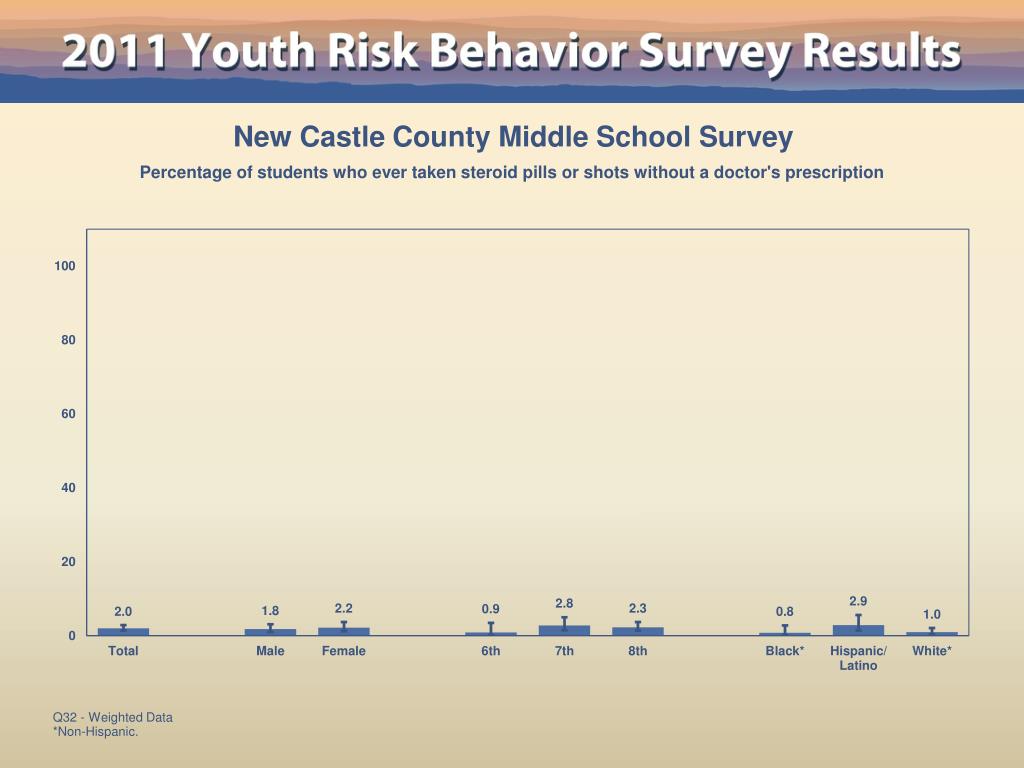 New Castle County Middle School Survey Percentage of students who ever taken steroid pills or shots without a doctor's prescription Q32 - Weighted Data *Non-Hispanic.