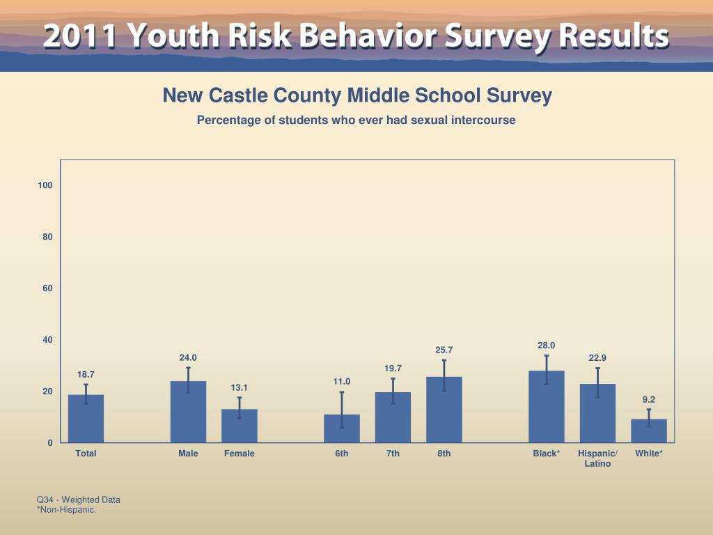 New Castle County Middle School Survey Percentage of students who ever had sexual intercourse Q34 - Weighted Data *Non-Hispanic.