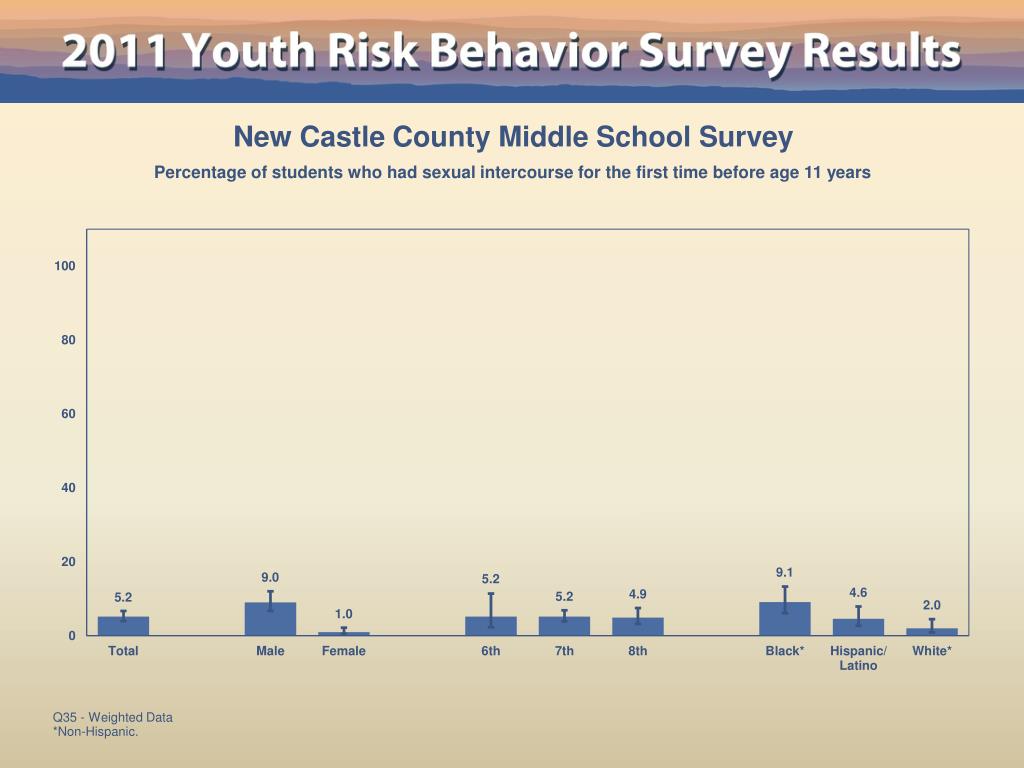 New Castle County Middle School Survey Percentage of students who had sexual intercourse for the first time before age 11 years Q35 - Weighted Data *Non-Hispanic.