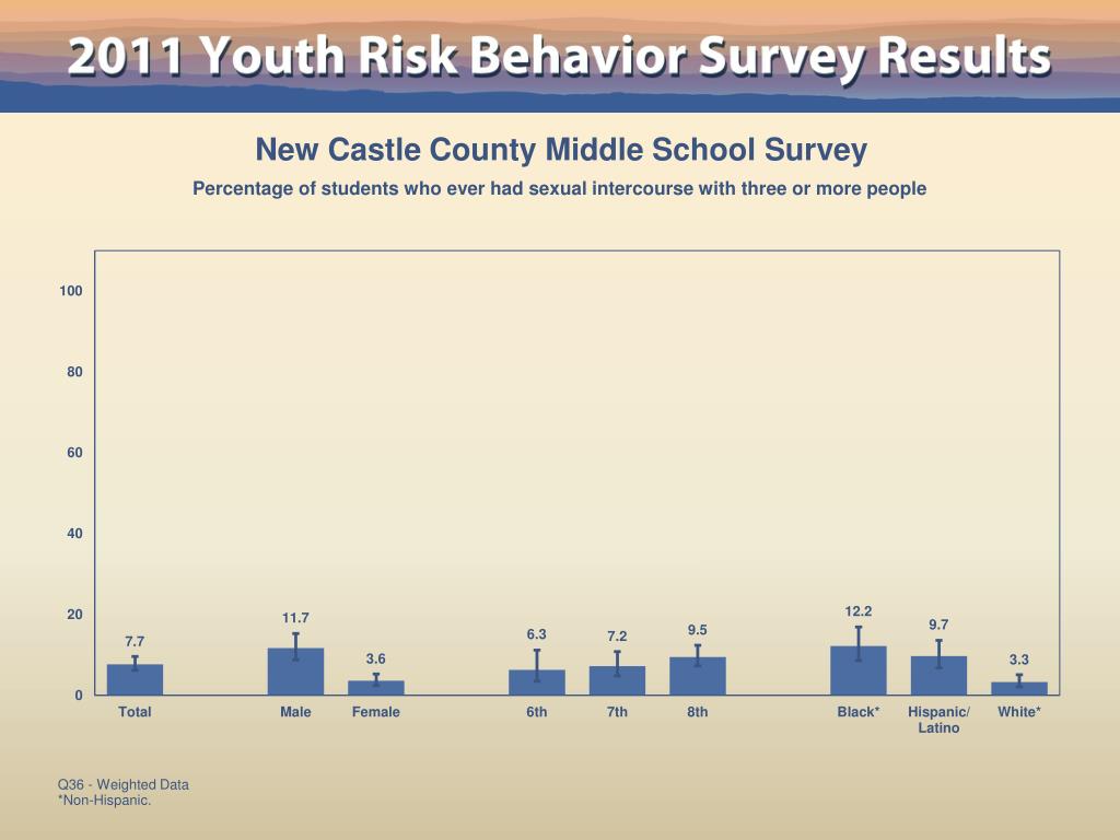 New Castle County Middle School Survey Percentage of students who ever had sexual intercourse with three or more people Q36 - Weighted Data *Non-Hispanic.