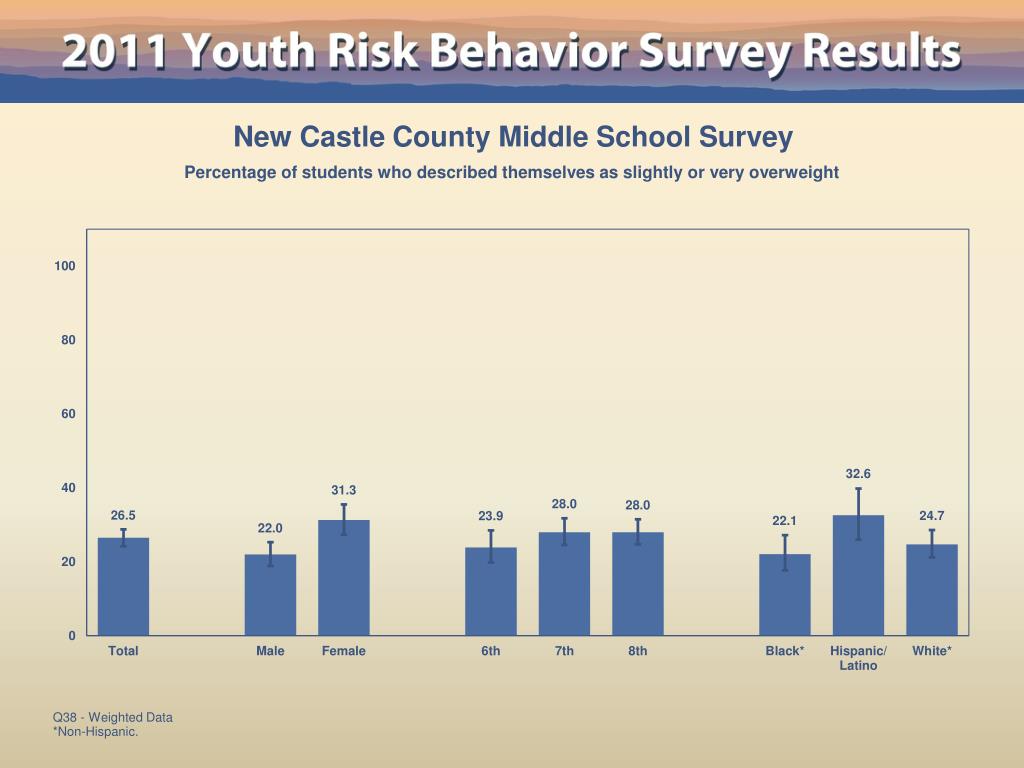 New Castle County Middle School Survey Percentage of students who described themselves as slightly or very overweight Q38 - Weighted Data *Non-Hispanic.