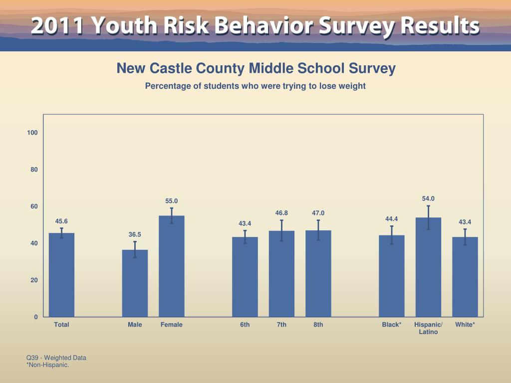 New Castle County Middle School Survey Percentage of students who were trying to lose weight Q39 - Weighted Data *Non-Hispanic.