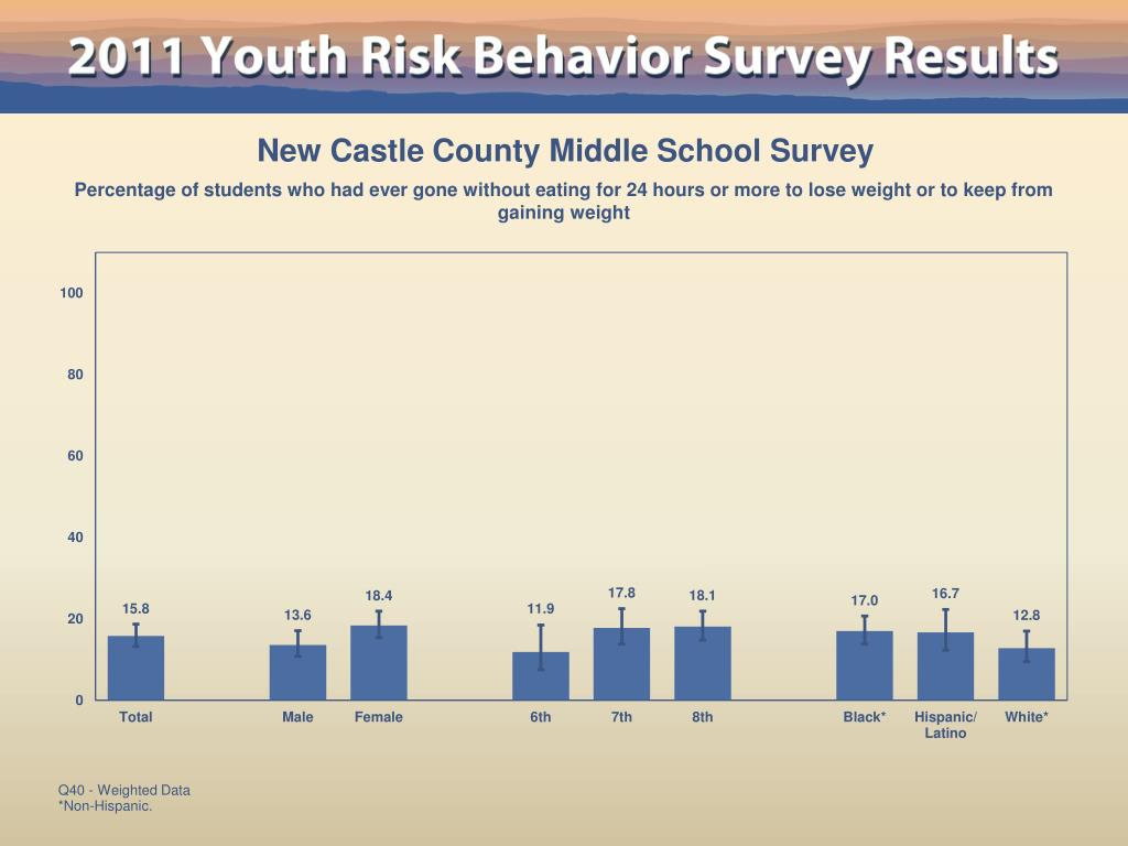 New Castle County Middle School Survey Percentage of students who had ever gone without eating for 24 hours or more to lose weight or to keep from gaining weight Q40 - Weighted Data *Non-Hispanic.