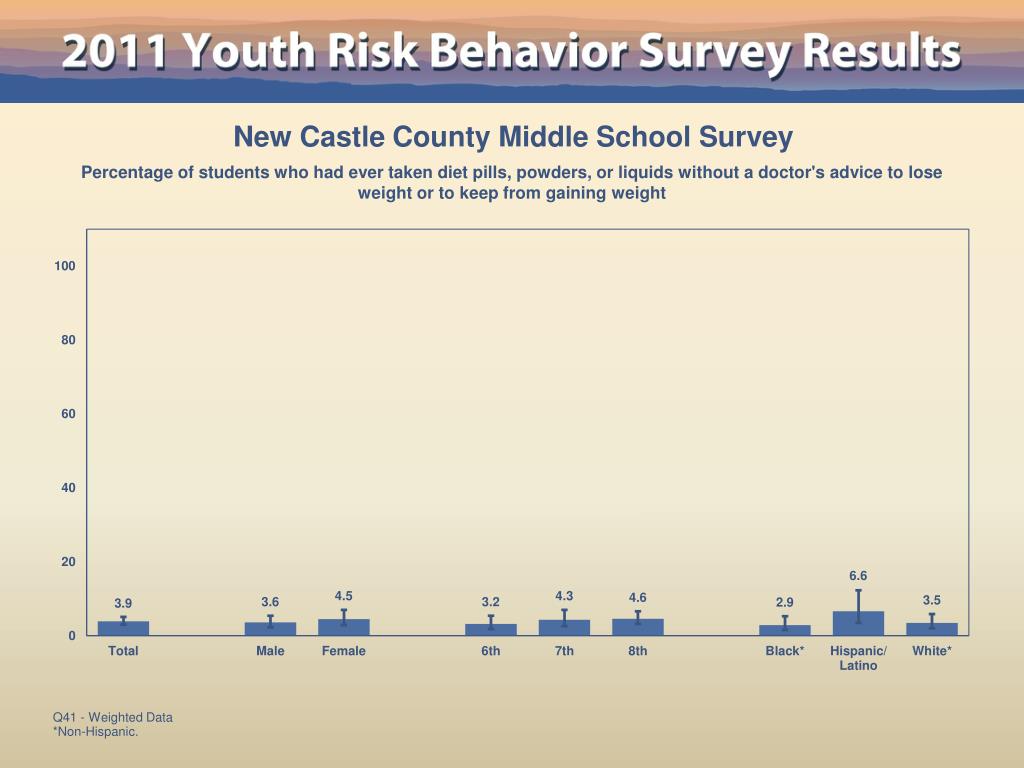 New Castle County Middle School Survey Percentage of students who had ever taken diet pills, powders, or liquids without a doctor's advice to lose weight or to keep from gaining weight Q41 - Weighted Data *Non-Hispanic.