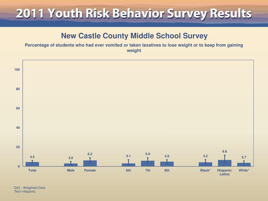 New Castle County Middle School Survey Percentage of students who had ever vomited or taken laxatives to lose weight or to keep from gaining weight Q42 - Weighted Data *Non-Hispanic.