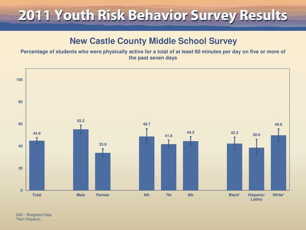 New Castle County Middle School Survey Percentage of students who were physically active for a total of at least 60 minutes per day on five or more of the past seven days Q43 - Weighted Data *Non-Hispanic.