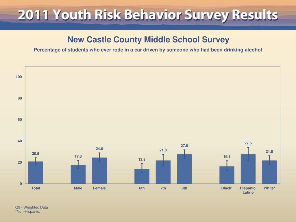 New Castle County Middle School Survey Percentage of students who ever rode in a car driven by someone who had been drinking alcohol Q9 - Weighted Data *Non-Hispanic.