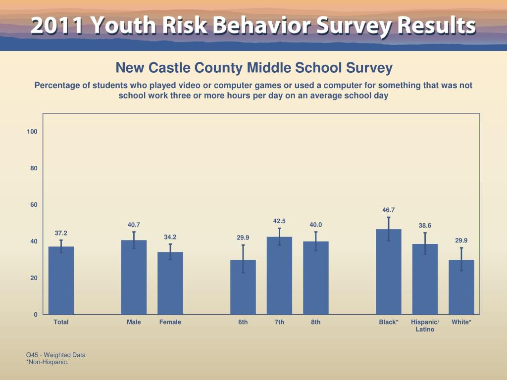 New Castle County Middle School Survey Percentage of students who played video or computer games or used a computer for something that was not school work three or more hours per day on an average school day Q45 - Weighted Data *Non-Hispanic.