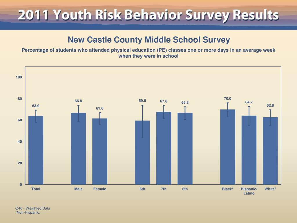 New Castle County Middle School Survey Percentage of students who attended physical education (PE) classes one or more days in an average week when they were in school Q46 - Weighted Data *Non-Hispanic.