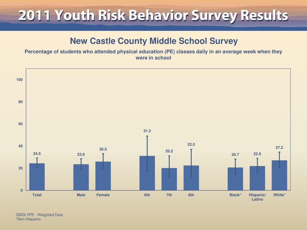 New Castle County Middle School Survey Percentage of students who attended physical education (PE) classes daily in an average week when they were in school QNDLYPE - Weighted Data *Non-Hispanic.