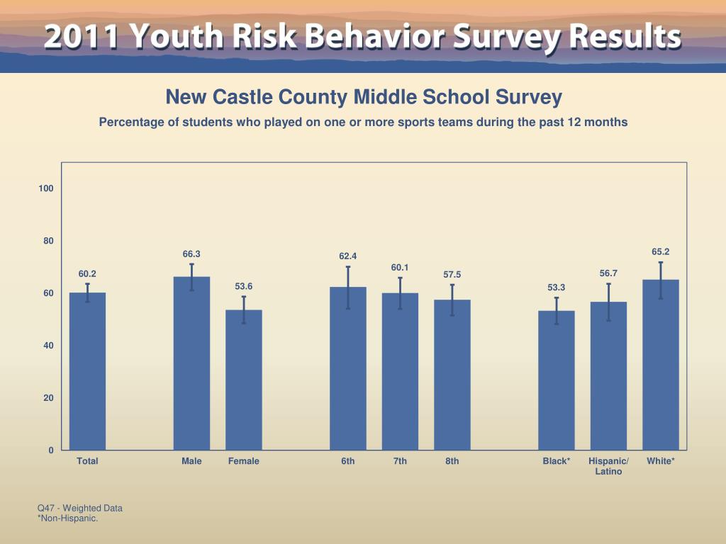New Castle County Middle School Survey Percentage of students who played on one or more sports teams during the past 12 months Q47 - Weighted Data *Non-Hispanic.
