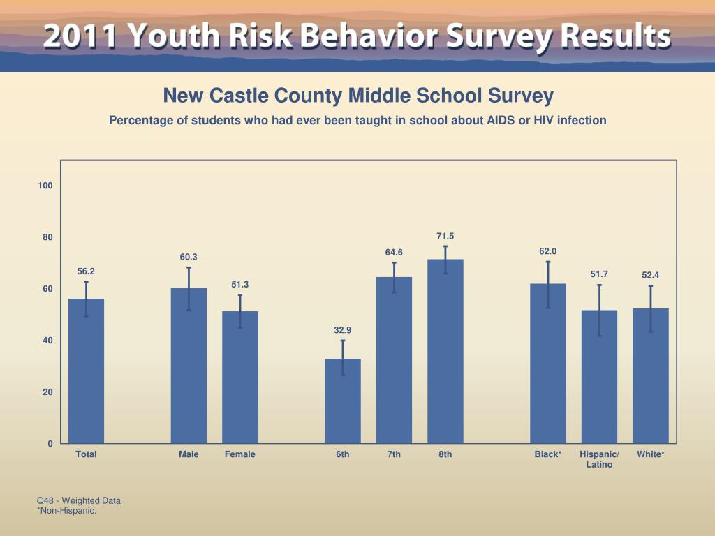 New Castle County Middle School Survey Percentage of students who had ever been taught in school about AIDS or HIV infection Q48 - Weighted Data *Non-Hispanic.