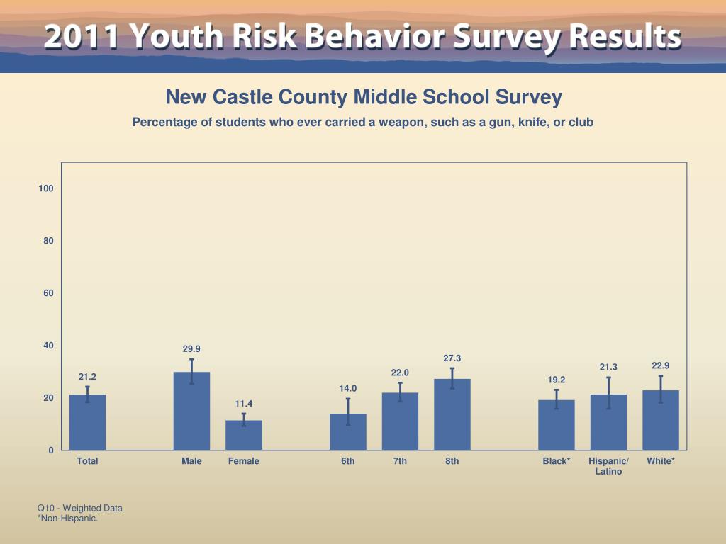 New Castle County Middle School Survey Percentage of students who ever carried a weapon, such as a gun, knife, or club Q10 - Weighted Data *Non-Hispanic.