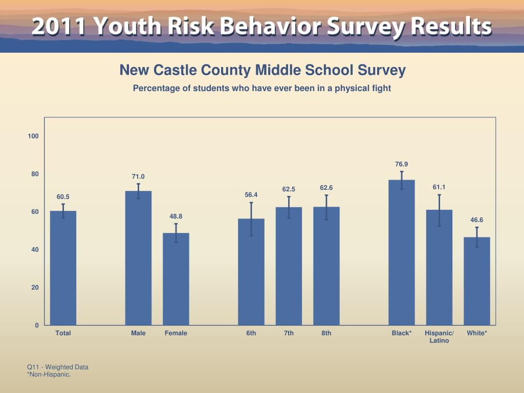 New Castle County Middle School Survey Percentage of students who have ever been in a physical fight Q11 - Weighted Data *Non-Hispanic.