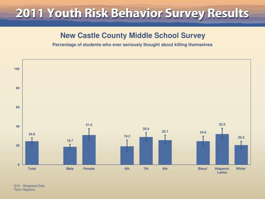 New Castle County Middle School Survey Percentage of students who ever seriously thought about killing themselves Q15 - Weighted Data *Non-Hispanic.