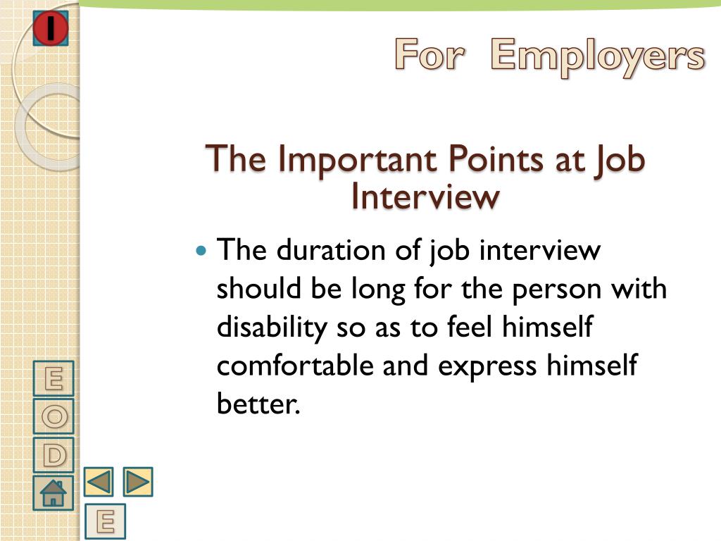 ForEmployers • The duration of job interview should be long for the person with disability so as to feel himself comfortable and express himself better. The Important Points at Job Interview E O D E