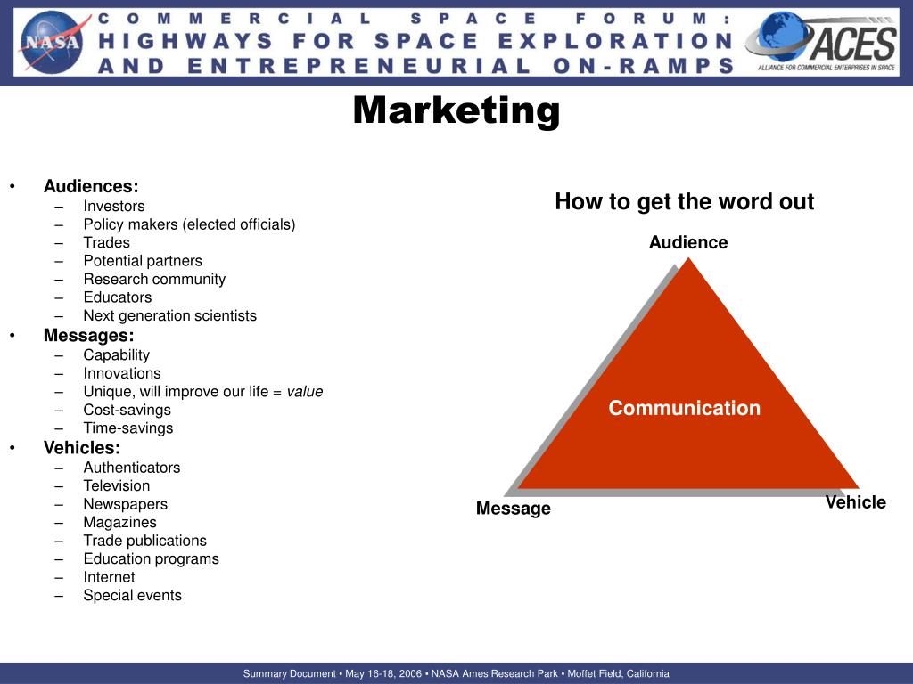 Audiences: Investors Policy makers (elected officials) Trades Potential partners Research community Educators Next generation scientists Messages: Capability Innovations Unique, will improve our life = value Cost-savings Time-savings Vehicles: Authenticators Television Newspapers Magazines Trade publications Education programs Internet Special events Marketing How to get the word out Audience Communication Vehicle Message