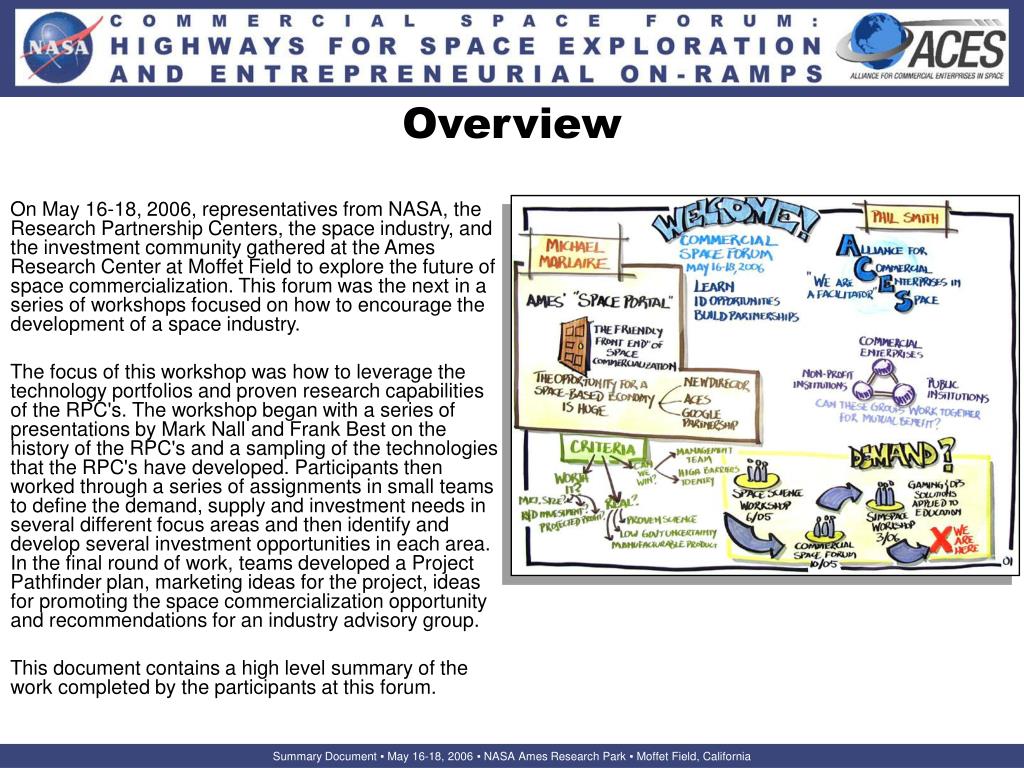 Overview On May 16-18, 2006, representatives from NASA, the Research Partnership Centers, the space industry, and the investment community gathered at the Ames Research Center at Moffet Field to explore the future of space commercialization. This forum was the next in a series of workshops focused on how to encourage the development of a space industry. The focus of this workshop was how to leverage the technology portfolios and proven research capabilities of the RPC's. The workshop began with a series of presentations by Mark Nall and Frank Best on the history of the RPC's and a sampling of the technologies that the RPC's have developed. Participants then worked through a series of assignments in small teams to define the demand, supply and investment needs in several different focus areas and then identify and develop several investment opportunities in each area. In the final round of work, teams developed a Project Pathfinder plan, marketing ideas for the project, ideas for promoting the space commercialization opportunity and recommendations for an industry advisory group. This document contains a high level summary of the work completed by the participants at this forum.