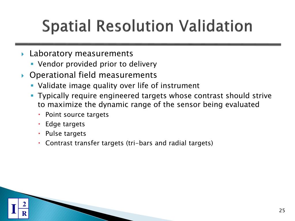 Spatial Resolution Validation • Laboratory measurements • Vendor provided prior to delivery • Operational field measurements • Validate image quality over life of instrument • Typically require engineered targets whose contrast should strive to maximize the dynamic range of the sensor being evaluated • Point source targets • Edge targets • Pulse targets • Contrast transfer targets (tri-bars and radial targets)