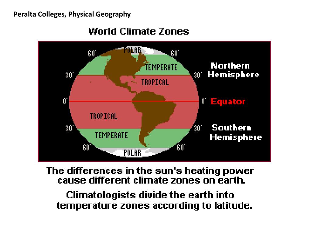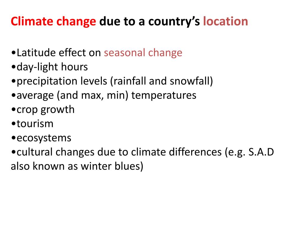 Climate change due to a country’s location • Latitude effect on seasonal change • day-light hours • precipitation levels (rainfall and snowfall) • average (and max, min) temperatures • crop growth • tourism • ecosystems • cultural changes due to climate differences (e.g. S.A.D also known as winter blues)