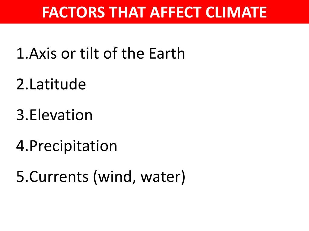 FACTORS THAT AFFECT CLIMATE • Axis or tilt of the Earth • Latitude • Elevation • Precipitation • Currents (wind, water)