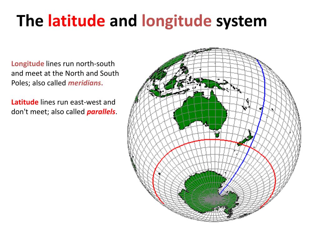 The latitude and longitude system Longitude lines run north-south and meet at the North and South Poles; also called meridians. Latitude lines run east-west and don't meet; also called parallels.