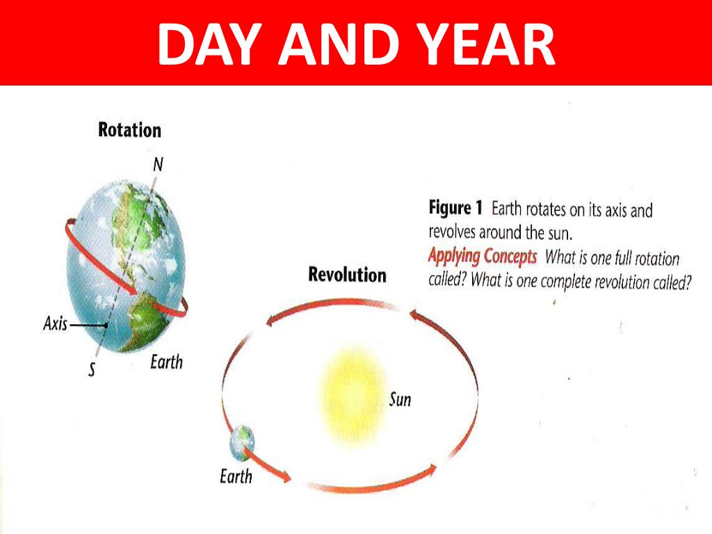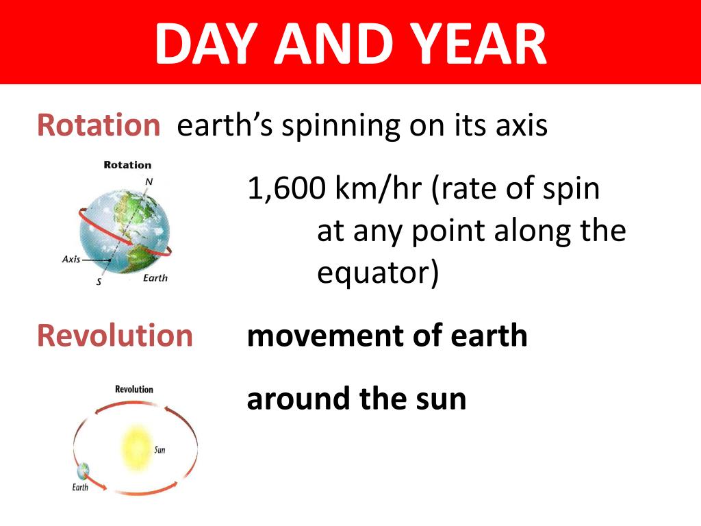 DAY AND YEAR Rotation earth’s spinning on its axis 1,600 km/hr (rate of spin at any point along the equator) Revolution movement of earth around the sun