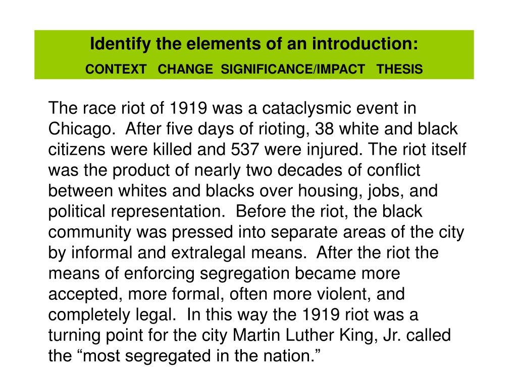 Identify the elements of an introduction: CONTEXT CHANGE SIGNIFICANCE/IMPACT THESIS The race riot of 1919 was a cataclysmic event in Chicago. After five days of rioting, 38 white and black citizens were killed and 537 were injured. The riot itself was the product of nearly two decades of conflict between whites and blacks over housing, jobs, and political representation. Before the riot, the black community was pressed into separate areas of the city by informal and extralegal means. After the riot the means of enforcing segregation became more accepted, more formal, often more violent, and completely legal. In this way the 1919 riot was a turning point for the city Martin Luther King, Jr. called the “most segregated in the nation.”