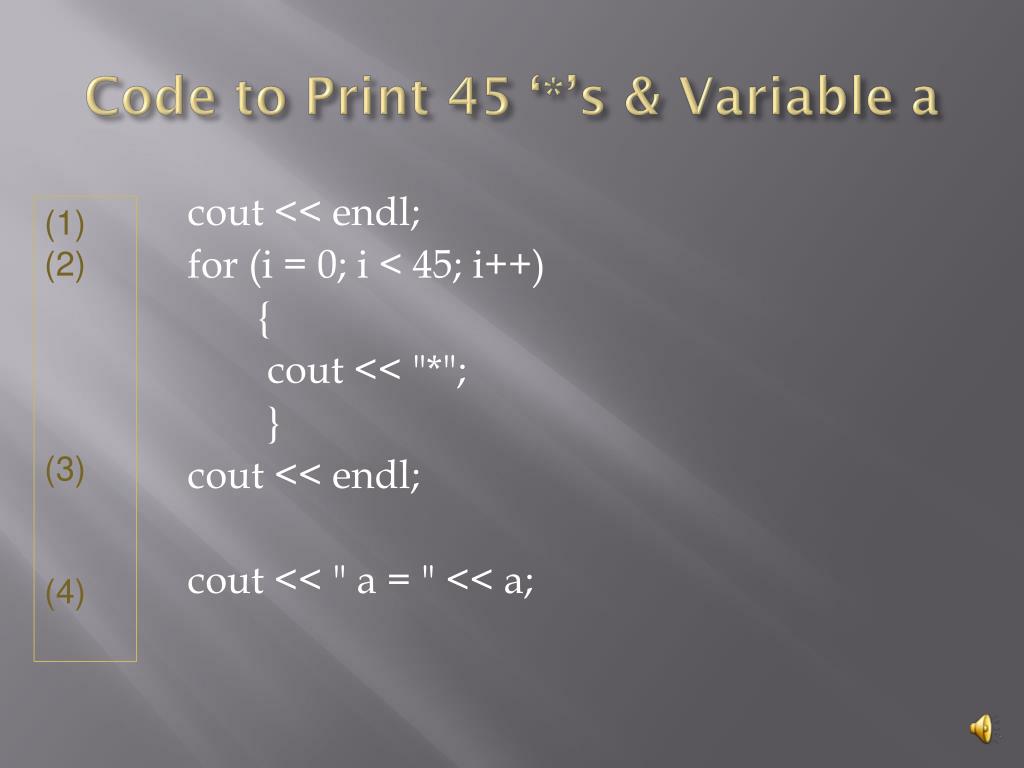 cout << endl; for (i = 0; i < 45; i++) { cout << "*"; } cout << endl; cout << " a = " << a; Code to Print 45 ‘*’s & Variable a (1) (2) (3) (4)
