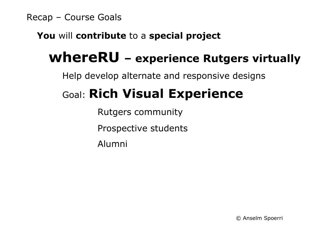 Recap – Course Goals • You will contribute to a special project • whereRU– experience Rutgers virtually Help develop alternate and responsive designs Goal: Rich Visual Experience Rutgers community Prospective students Alumni