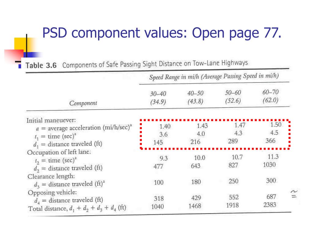Four components of PSD (cont) Difference in speed Average speed is used. Speed of the passer Or, simply d1 = uit + ½*at2 It is the distance traveled with a constant acceleration rate starting at ui, the speed of the impeder. d3 = empirical value d4 = 2/3 (d2)