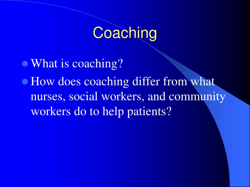 Coaching • What is coaching? • How does coaching differ from what nurses, social workers, and community workers do to help patients?