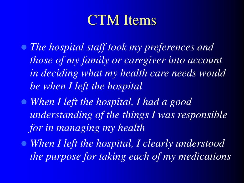 CTM Items • The hospital staff took my preferences and those of my family or caregiver into account in deciding what my health care needs would be when I left the hospital • When I left the hospital, I had a good understanding of the things I was responsible for in managing my health • When I left the hospital, I clearly understood the purpose for taking each of my medications