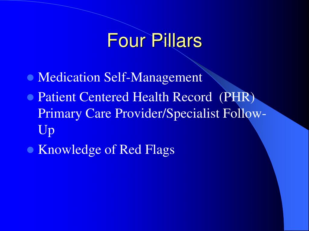 Four Pillars • Medication Self-Management • Patient Centered Health Record (PHR) Primary Care Provider/Specialist Follow-Up • Knowledge of Red Flags