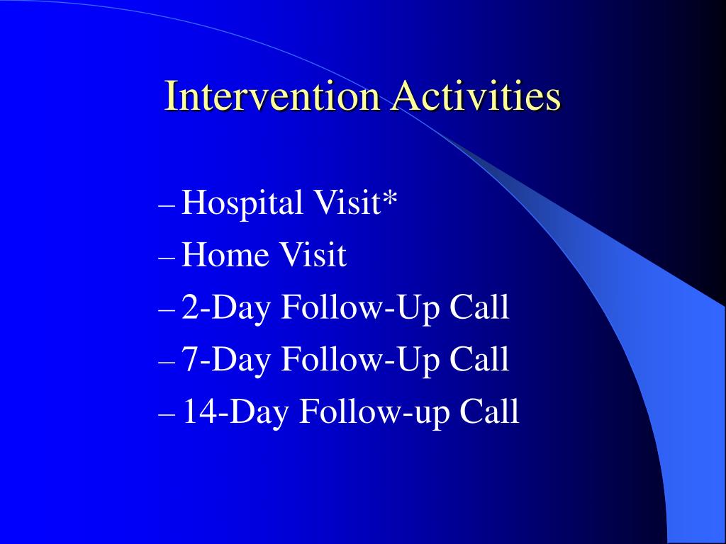 Intervention Activities • Hospital Visit* • Home Visit • 2-Day Follow-Up Call • 7-Day Follow-Up Call • 14-Day Follow-up Call