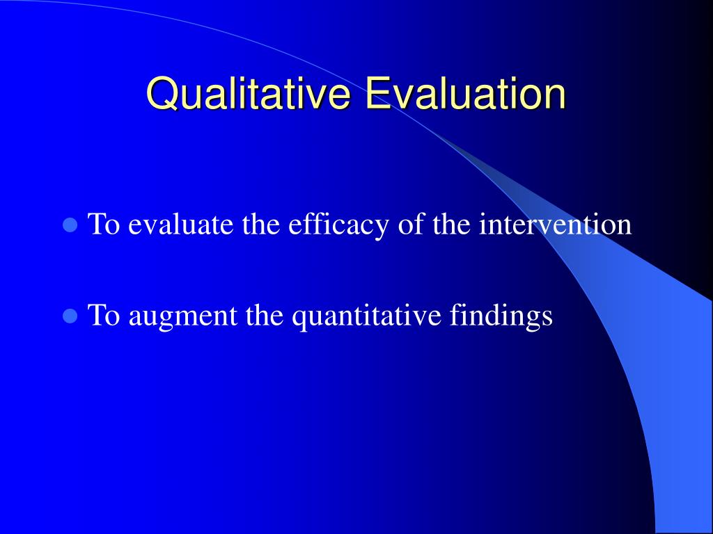 Qualitative Evaluation • To evaluate the efficacy of the intervention • To augment the quantitative findings