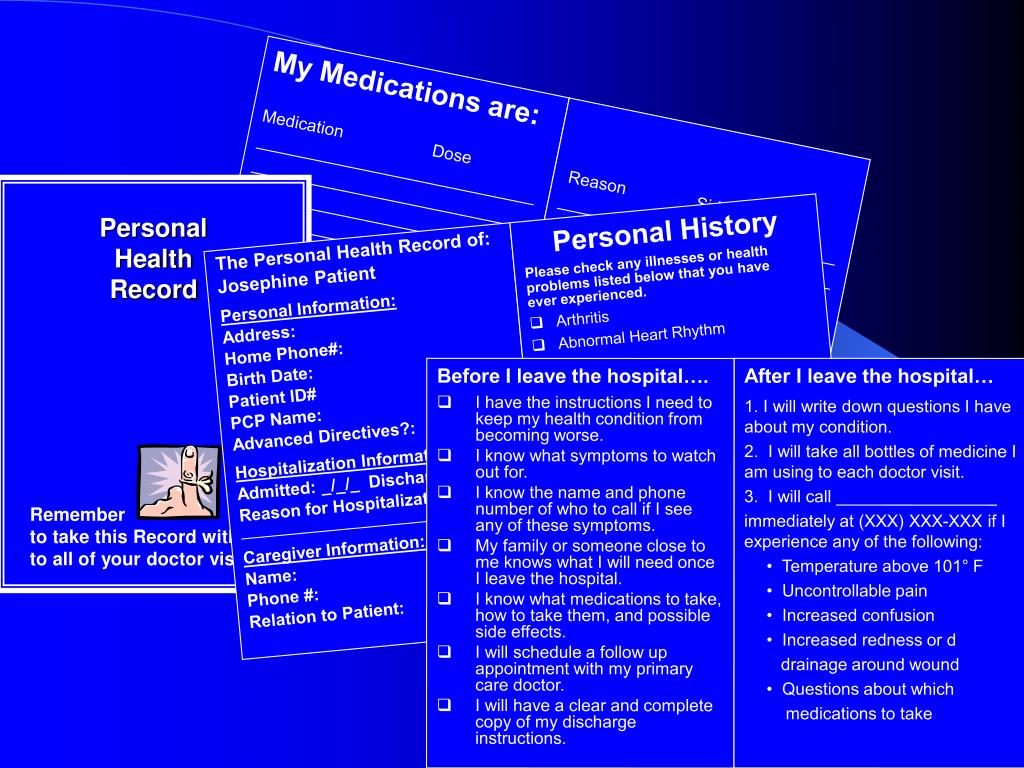 Key Elements of the Personal Health Record • Record of patient’s medical history • Red flags, or warning signs • Medication list and allergies • Advance Directives • Structured Checklist of critical activities (instructions, f/u appointments) • Space for patient questions and concerns