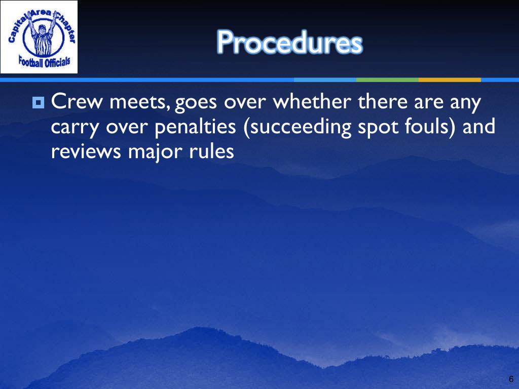 Procedures • Crew meets, goes over whether there are any carry over penalties (succeeding spot fouls) and reviews major rules
