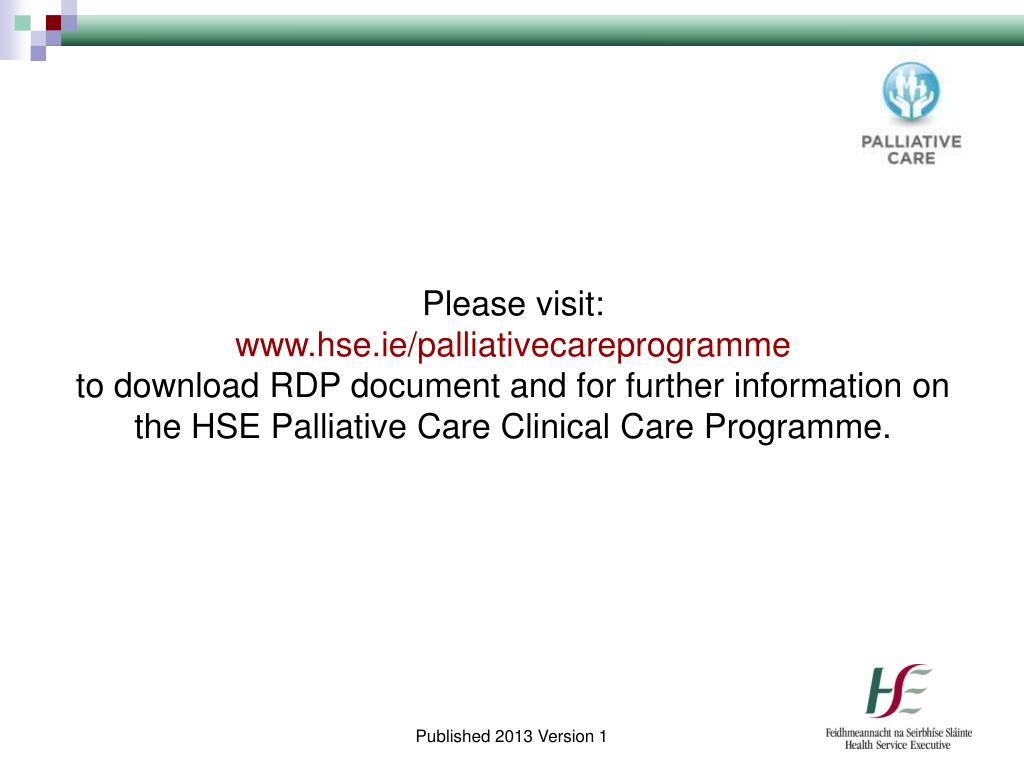 Please visit: www.hse.ie/palliativecareprogrammeto download RDP document and for further information on the HSE Palliative Care Clinical Care Programme. Published 2013 Version 1
