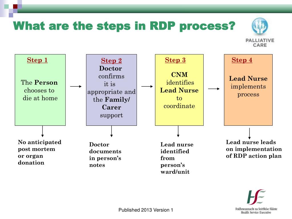 What are the steps in RDP process? The Person chooses to die at home Step 1 Step 2 Doctor confirms it is appropriate and the Family/ Carer support CNM identifies Lead Nurse to coordinate Step 3 Lead Nurse implements process Step 4 No anticipated post mortem or organ donation Lead nurse leads on implementation of RDP action plan Doctor documents in person’s notes Lead nurse identified from person’s ward/unit Published 2013 Version 1