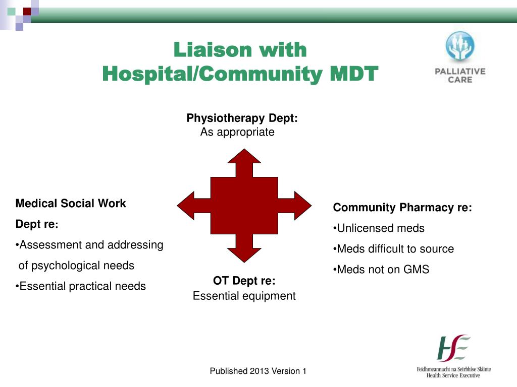 Liaison with Hospital/Community MDT Physiotherapy Dept: As appropriate • Medical Social Work • Dept re: • Assessment and addressing • of psychological needs • Essential practical needs • Community Pharmacy re: • Unlicensed meds • Meds difficult to source • Meds not on GMS OT Dept re: Essential equipment Published 2013 Version 1