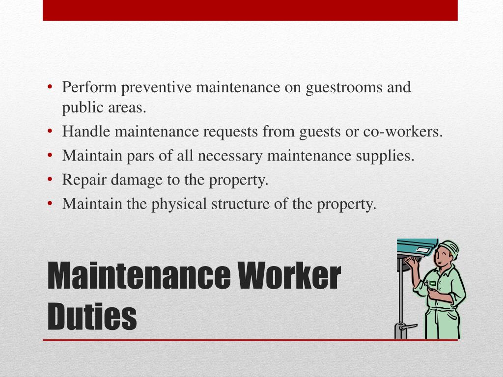 Perform preventive maintenance on guestrooms and public areas. • Handle maintenance requests from guests or co-workers. • Maintain pars of all necessary maintenance supplies. • Repair damage to the property. • Maintain the physical structure of the property. Maintenance Worker Duties