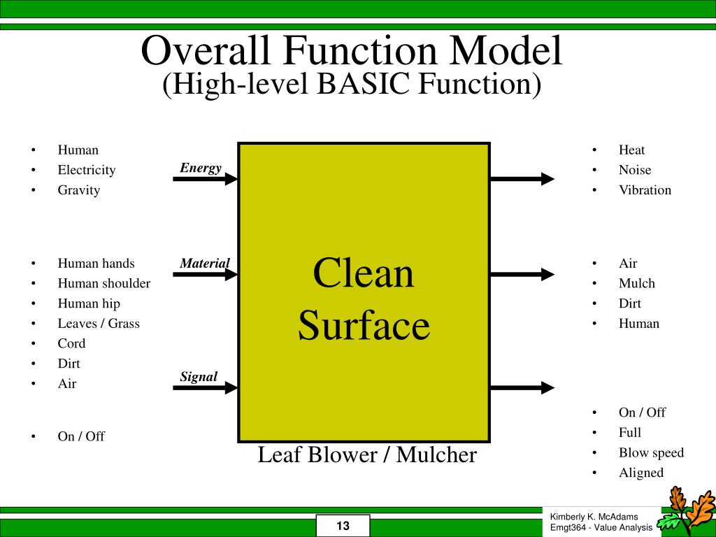Overall Function Model(High-level BASIC Function) • Heat • Noise • Vibration Clean Surface • Human • Electricity • Gravity Energy • Human hands • Human shoulder • Human hip • Leaves / Grass • Cord • Dirt • Air Material • Air • Mulch • Dirt • Human Signal • On / Off • Full • Blow speed • Aligned • On / Off Leaf Blower / Mulcher