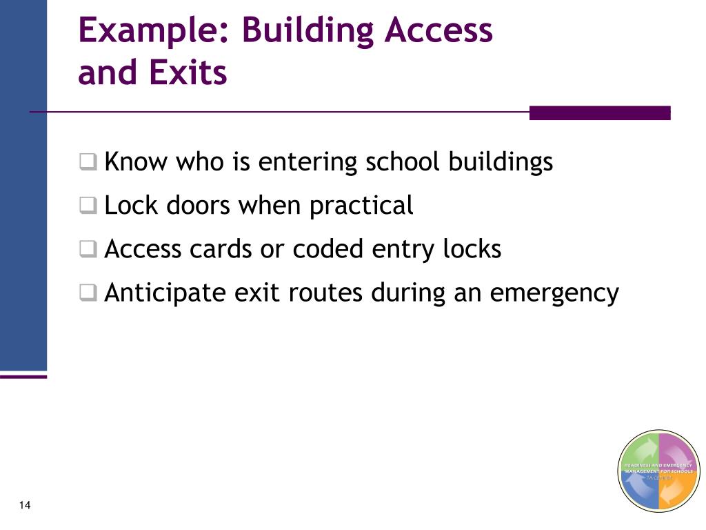 Example: Building Accessand Exits • Know who is entering school buildings • Lock doors when practical • Access cards or coded entry locks • Anticipate exit routes during an emergency
