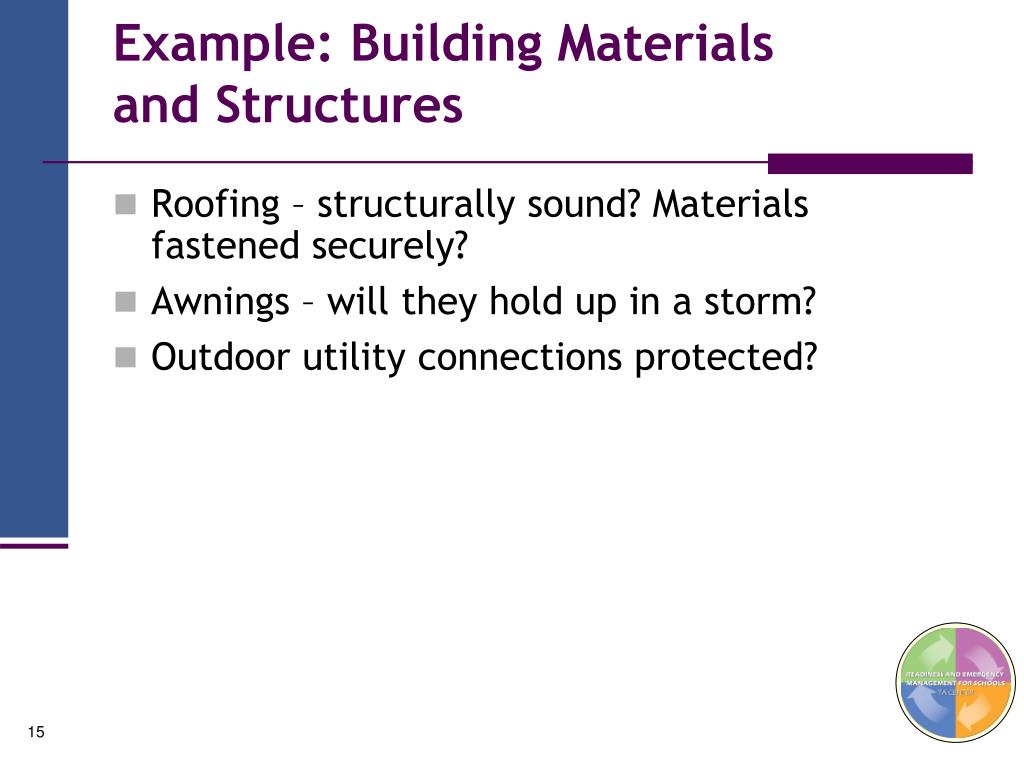 Example: Building Materialsand Structures Roofing – structurally sound? Materials fastened securely? Awnings – will they hold up in a storm? Outdoor utility connections protected?