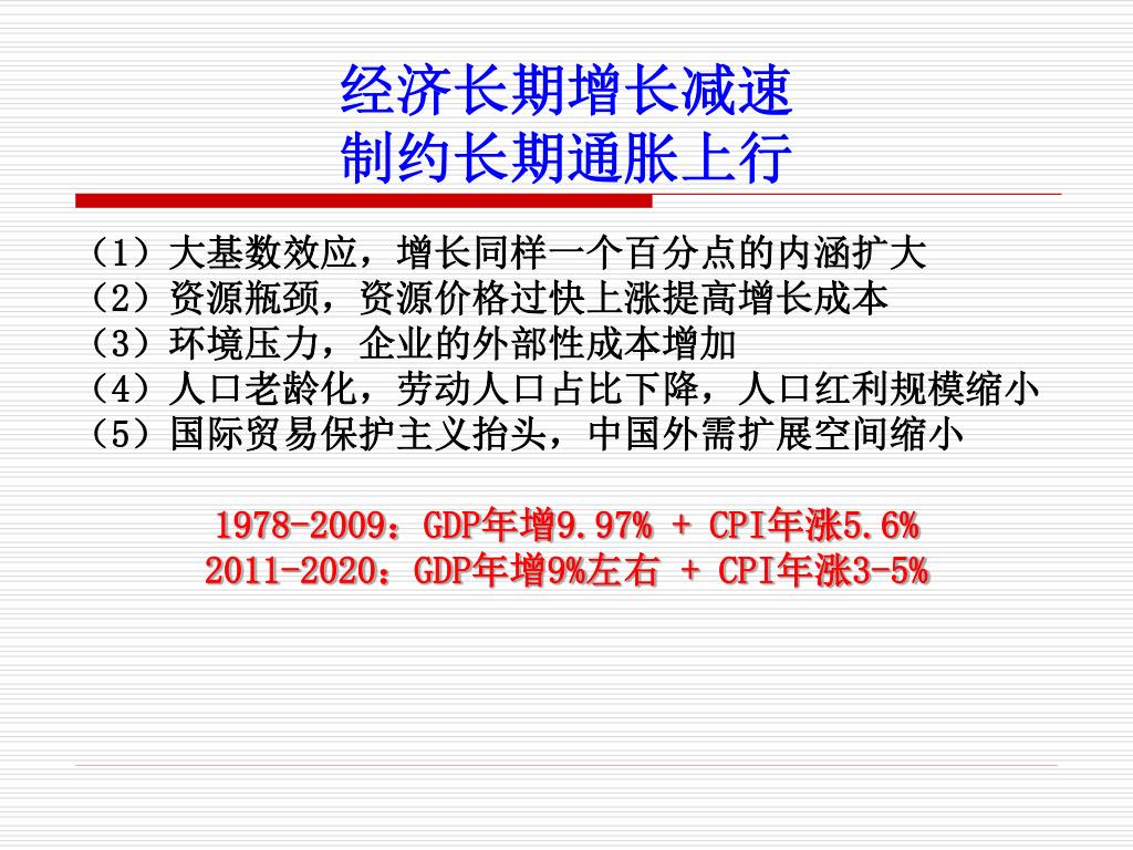 经济长期增长减速制约长期通胀上行 (1)大基数效应,增长同样一个百分点的内涵扩大 (2)资源瓶颈,资源价格过快上涨提高增长成本 (3)环境压力,企业的外部性成本增加 (4)人口老龄化,劳动人口占比下降,人口红利规模缩小 (5)国际贸易保护主义抬头,中国外需扩展空间缩小 1978-2009:GDP年增9.97%+ CPI年涨5.6% 2011-2020:GDP年增9%左右 + CPI年涨3-5%