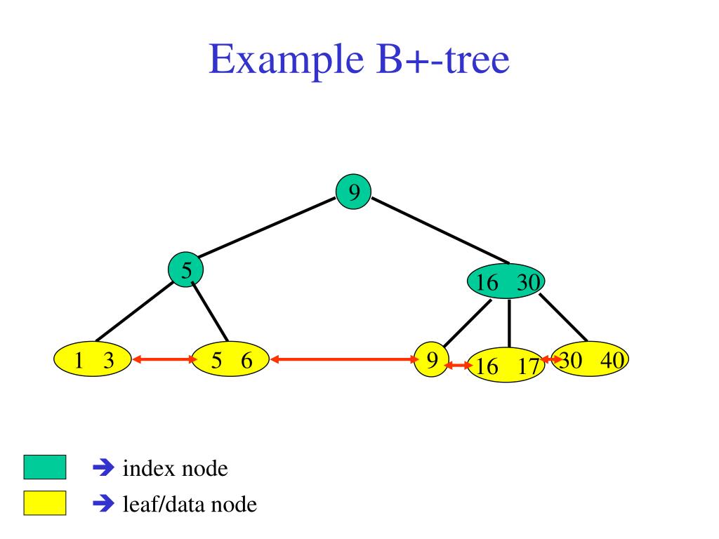 Example B+-tree 9 5 16 30 1 3 5 6 9 30 40 16 17 index node leaf/data node