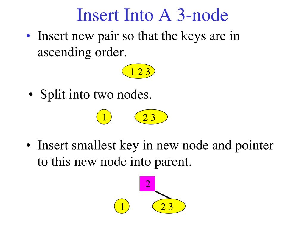 2 3 1 2 3 2 3 1 1 2 Insert Into A 3-node • Insert new pair so that the keys are in ascending order. • Split into two nodes. • Insert smallest key in new node and pointer to this new node into parent.