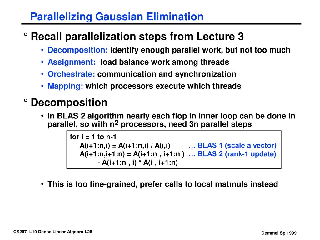 Parallelizing Gaussian Elimination • Recall parallelization steps from Lecture 3 • Decomposition: identify enough parallel work, but not too much • Assignment: load balance work among threads • Orchestrate: communication and synchronization • Mapping: which processors execute which threads • Decomposition • In BLAS 2 algorithm nearly each flop in inner loop can be done in parallel, so with n2 processors, need 3n parallel steps • This is too fine-grained, prefer calls to local matmuls instead for i = 1 to n-1 A(i+1:n,i) = A(i+1:n,i) / A(i,i) … BLAS 1 (scale a vector) A(i+1:n,i+1:n) = A(i+1:n , i+1:n ) … BLAS 2 (rank-1 update) - A(i+1:n , i) * A(i , i+1:n)