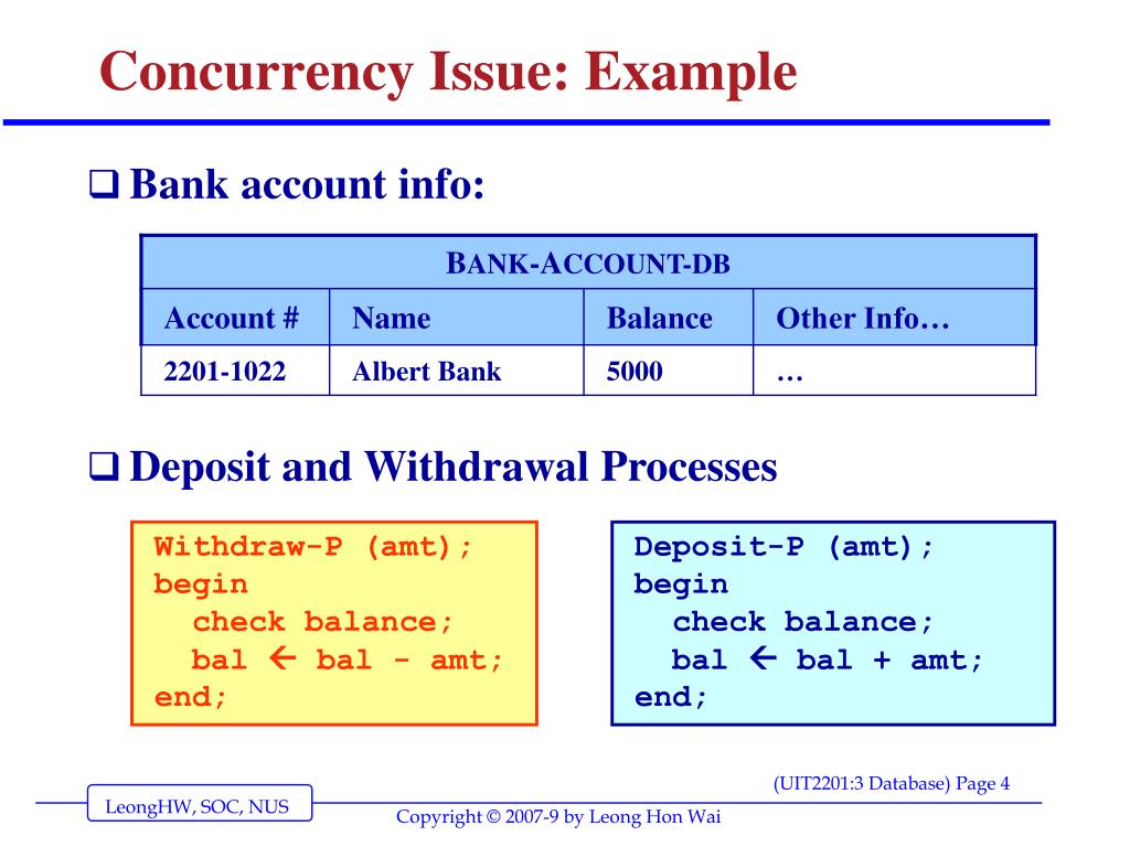 Concurrency Issue: Example • Bank account info: • Deposit and Withdrawal Processes Withdraw-P (amt); begin check balance; bal bal - amt; end; Deposit-P (amt); begin check balance; bal bal + amt; end;